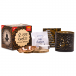 Un diffuseur en fer forgé, une plaque de cuivre, un support en liège, une bougie, un échantillon brique d'encens.